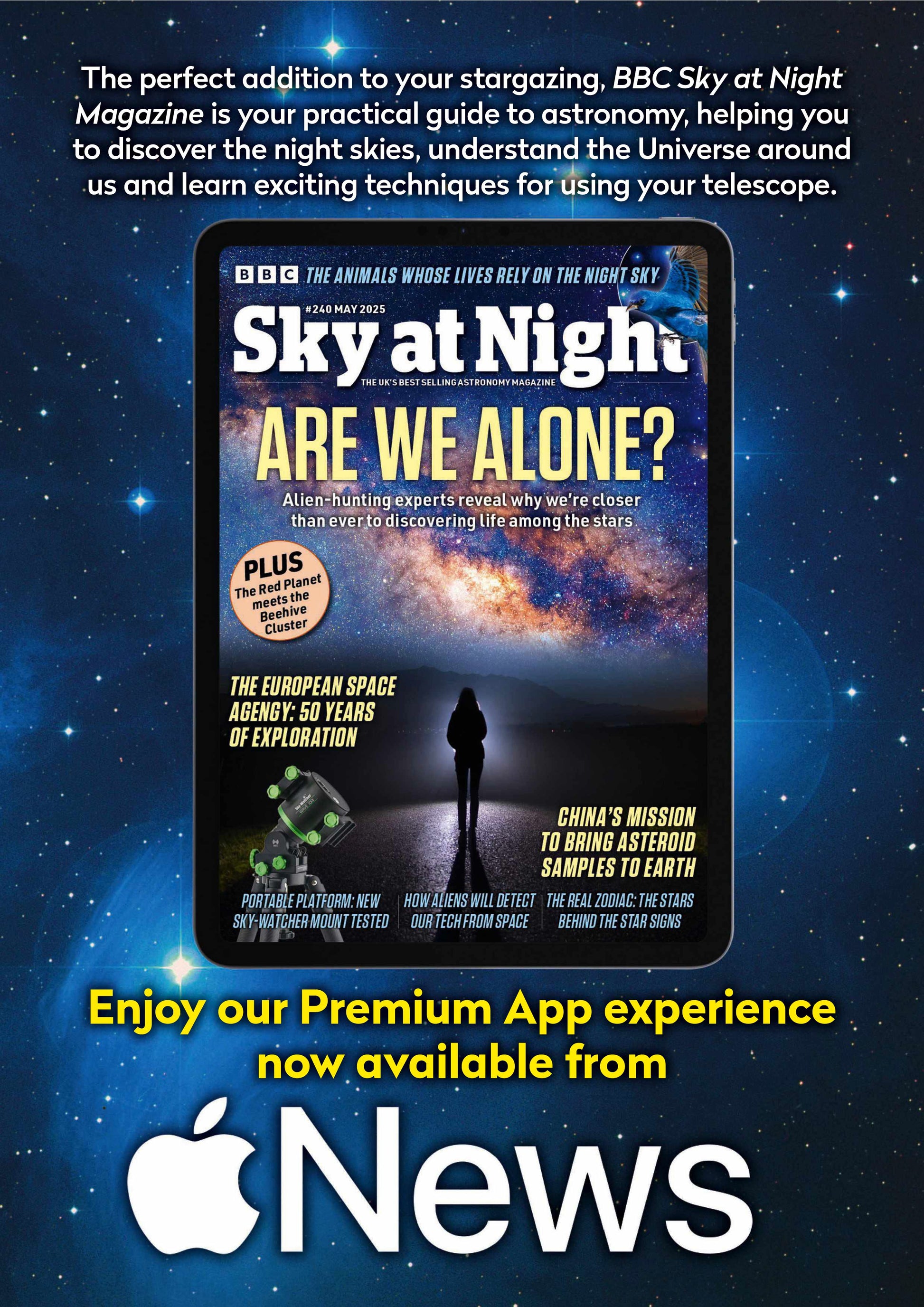 BBC Sky at Night magazine complements the BBC’s popular and longrunning TV series, presented by Sir Patrick Moore. BBC Sky at Night magazine is the only real guide to astronomy. Every issue of BBC Sky at Night magazine brings you observing tips, star charts, buyers’ guides, the latest in cosmological research, exclusive features by Sir Patrick Moore.